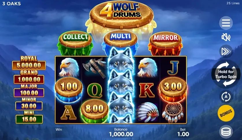 Hrajte automat 4 Wolf Drums online zdarma v demo režimu bez nutnosti stáhnout si tento výherní automat a bez registrace